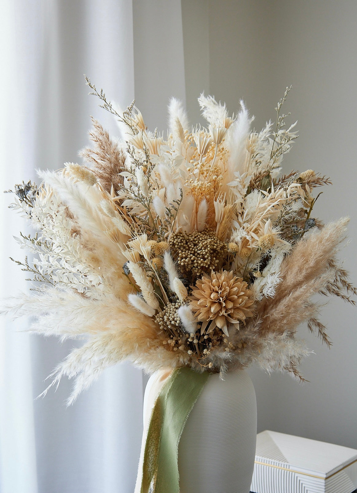 The main benefit of dried flowers is that they can be purchased long in advance, up to 1 year. Simply, keep them in the packaging in a dry place until your wedding day, and take out to fluff them up a day before. They will look perfect!