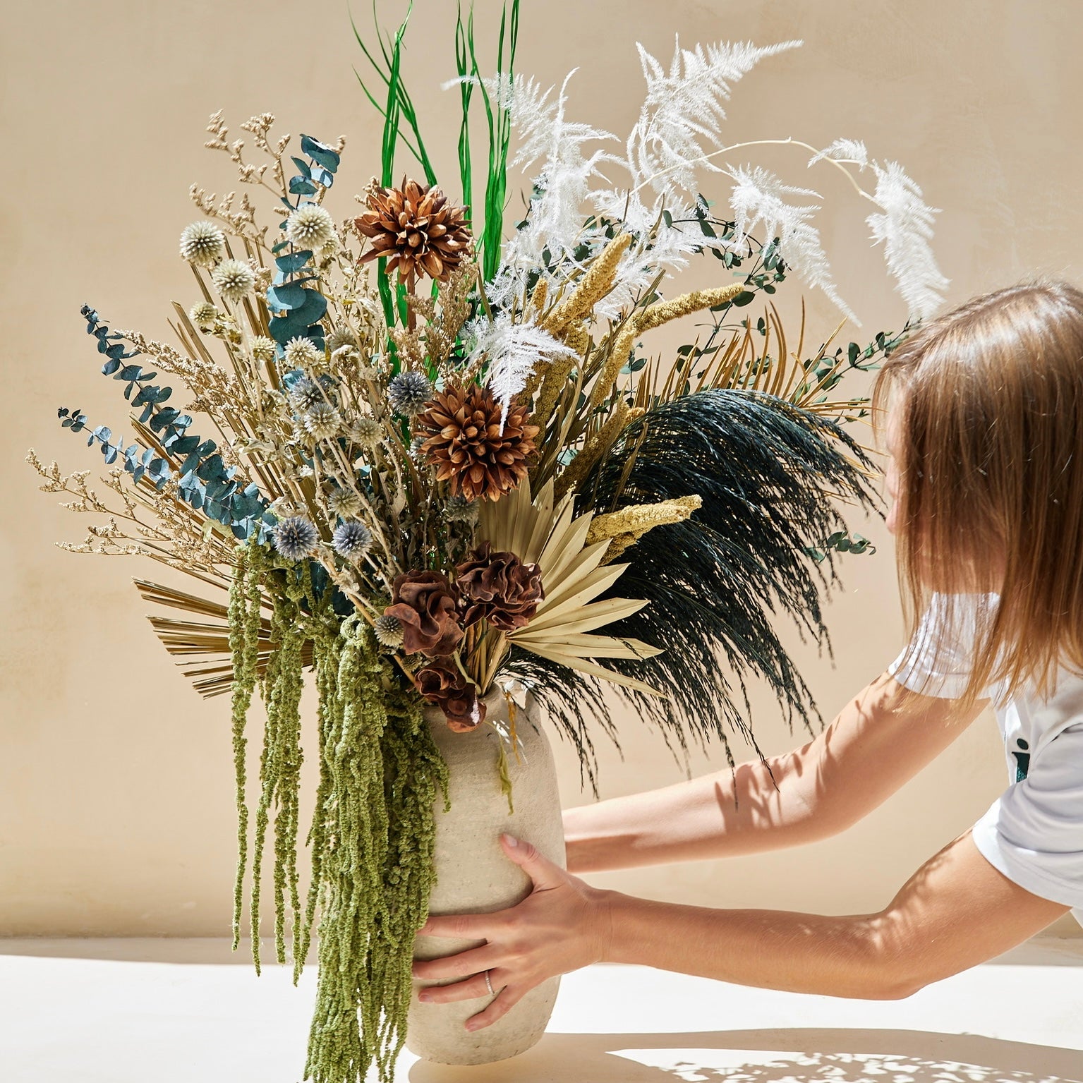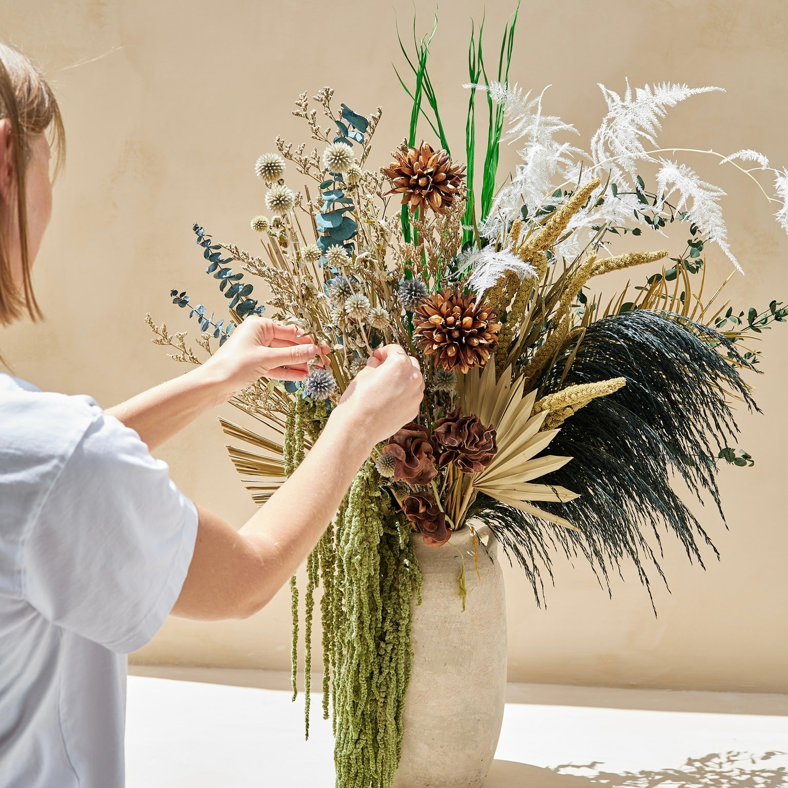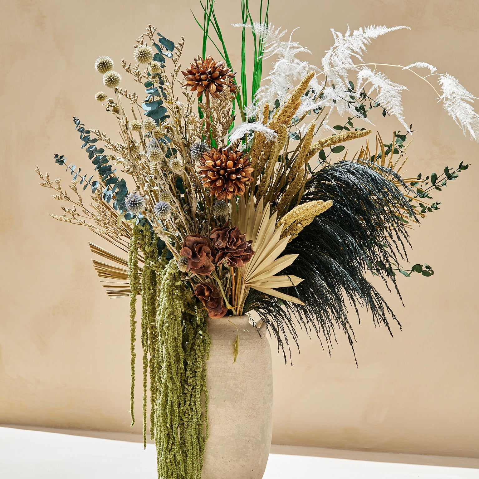 Compositions: Dried palm leaves, preserved eucalyptus, natural limonium, wood flowers, millet, fern, pampas grass, echinops, hanging amaranthus, and more.