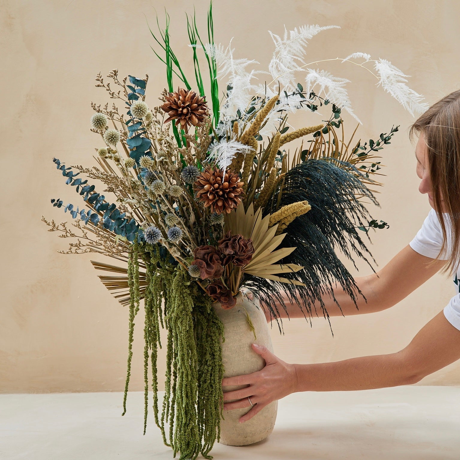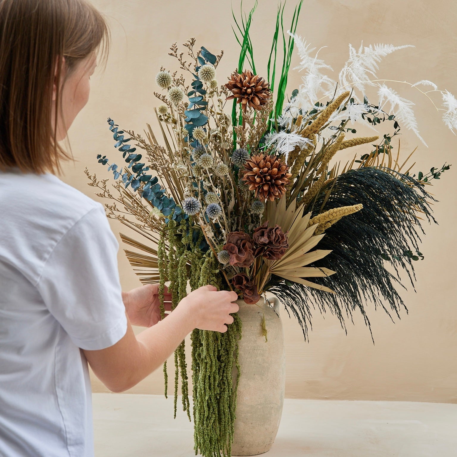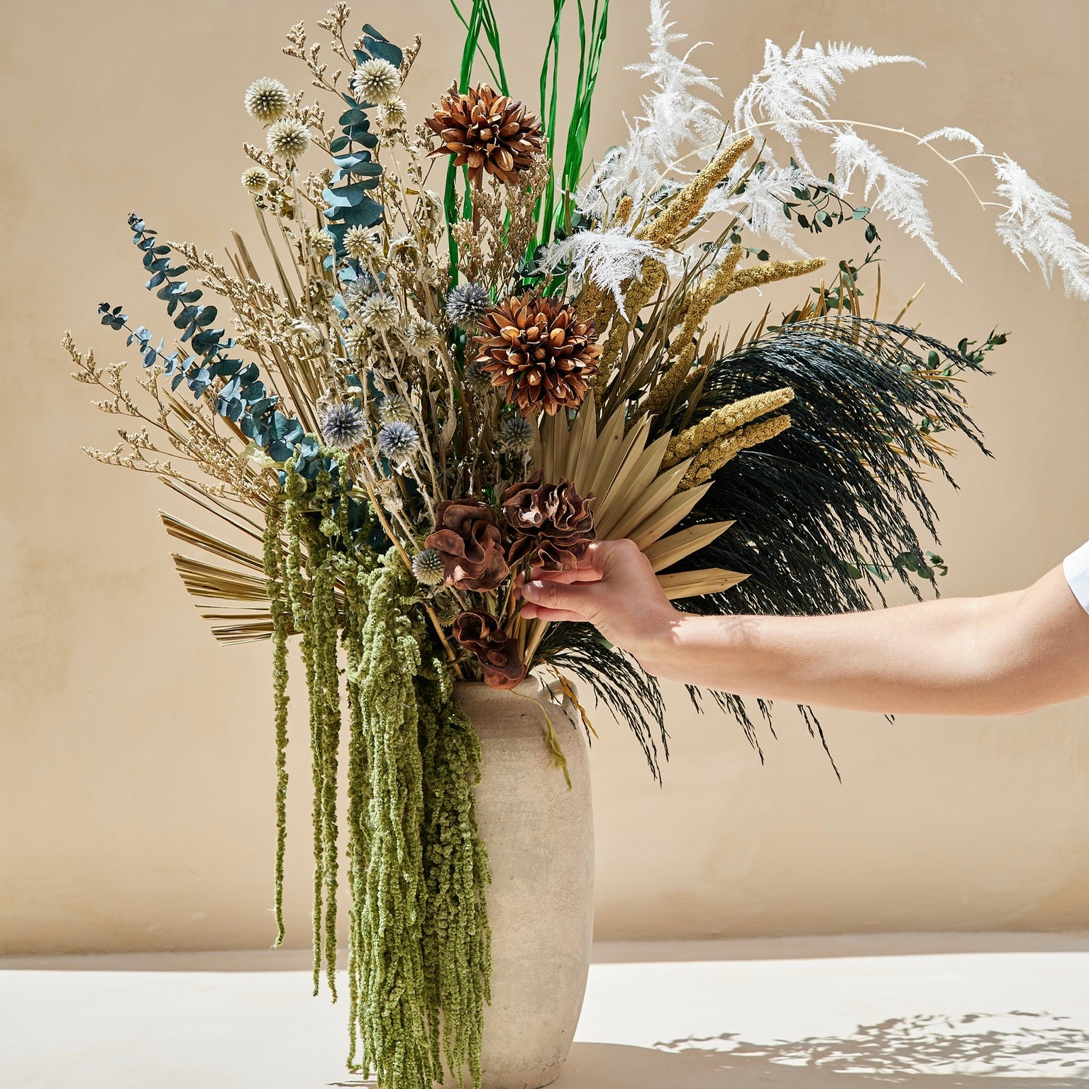 Compositions: Dried palm leaves, preserved eucalyptus, natural limonium, wood flowers, millet, fern, pampas grass, echinops, hanging amaranthus, and more.