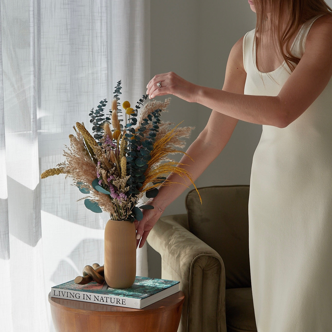 Composition: dried pampas grass in brown and golden natural, preserved eucalyptus mix in blue, natural limonium, billy balls in yellow, and more.