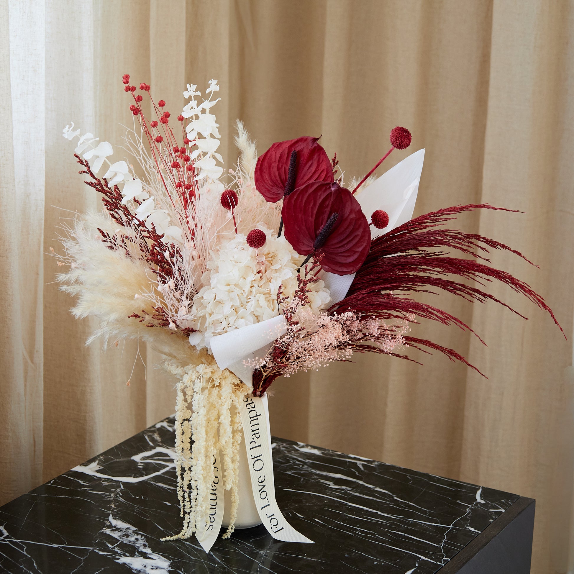Preserved hydrangea in white, preserved anthurium in burgundy, dried pampas grass in beige and burgundy, limonium in red, billy balls in red, preserved eucalyptus in white, and more.