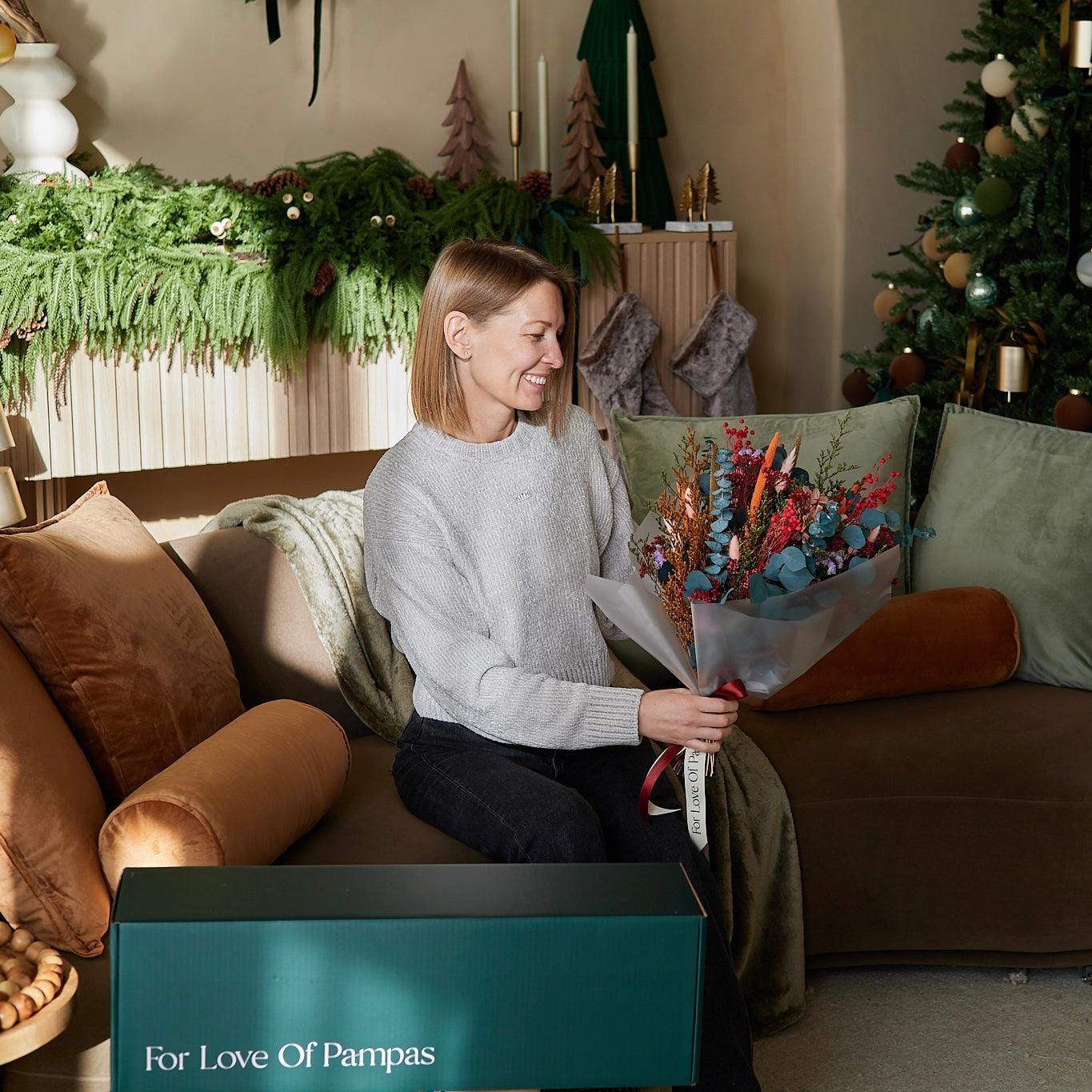 A festive limited-edition bouquet designed to brighten the season and stay beautiful long after. Mauve hydrangea, blue eucalyptus, and red-green accents come together in a rich, full arrangement - paired with our burgundy Orb Vase for a striking holiday moment.