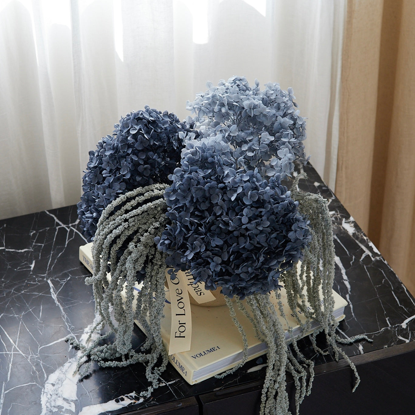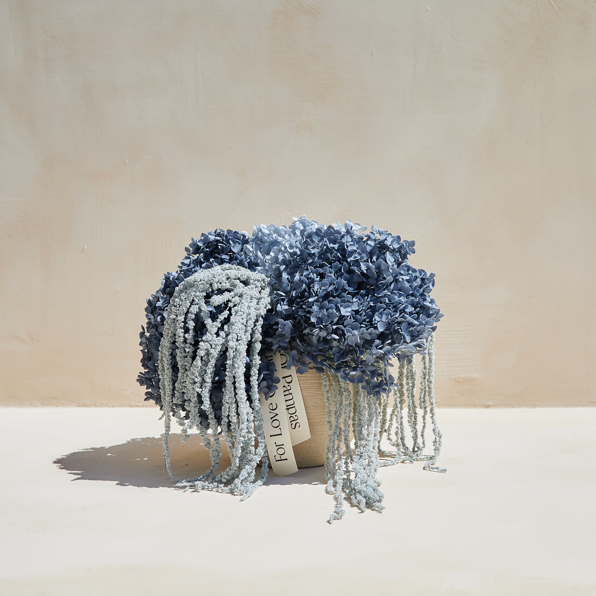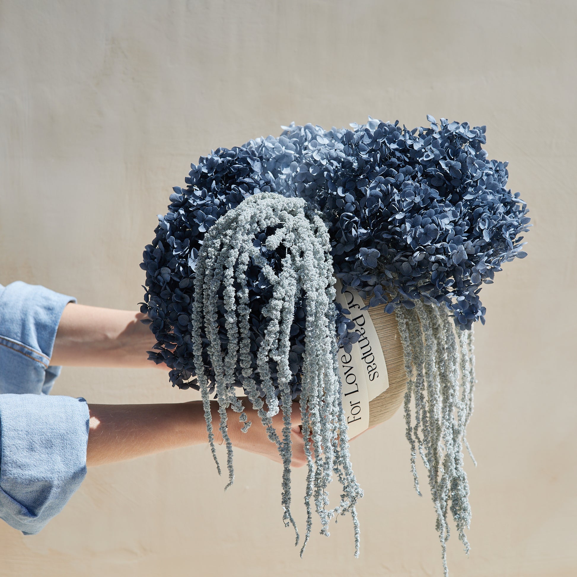 A sophisticated, long-lasting arrangement in low round vase. Preserved hydrangeas and cascading amaranthus in serene blue tones can be arranged to your liking to create an impressive arrangement for your home.