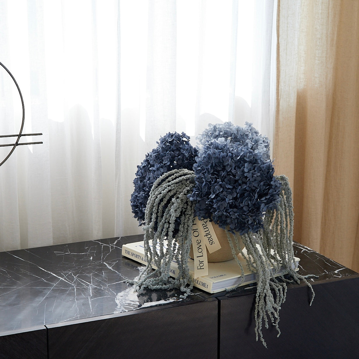 Composition: preserved hydrangea in dark blue & light blue, preserved hanging amaranthus in gray.