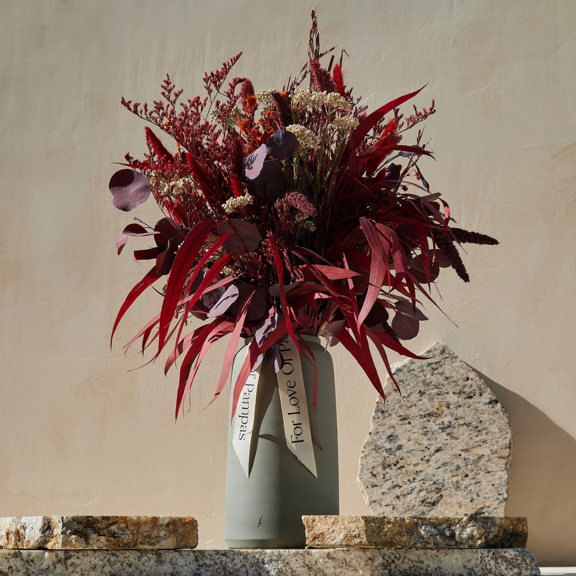 ”Scarlet” is a bold, monochromatic arrangement featuring preserved weeping willow, red limonium, and cream rice flowers, accentuated with fiery red thistle and other vibrant grasses.