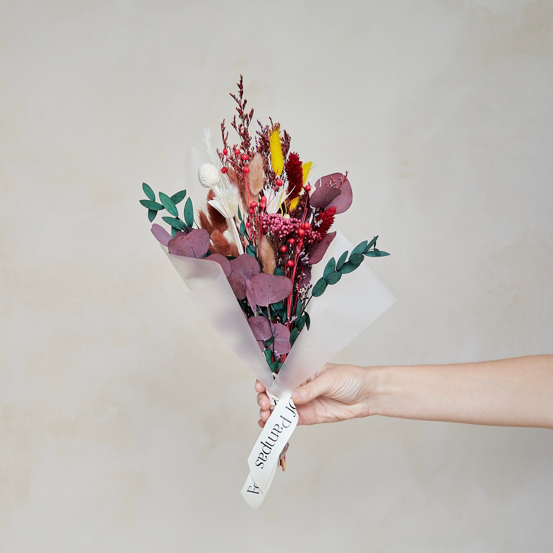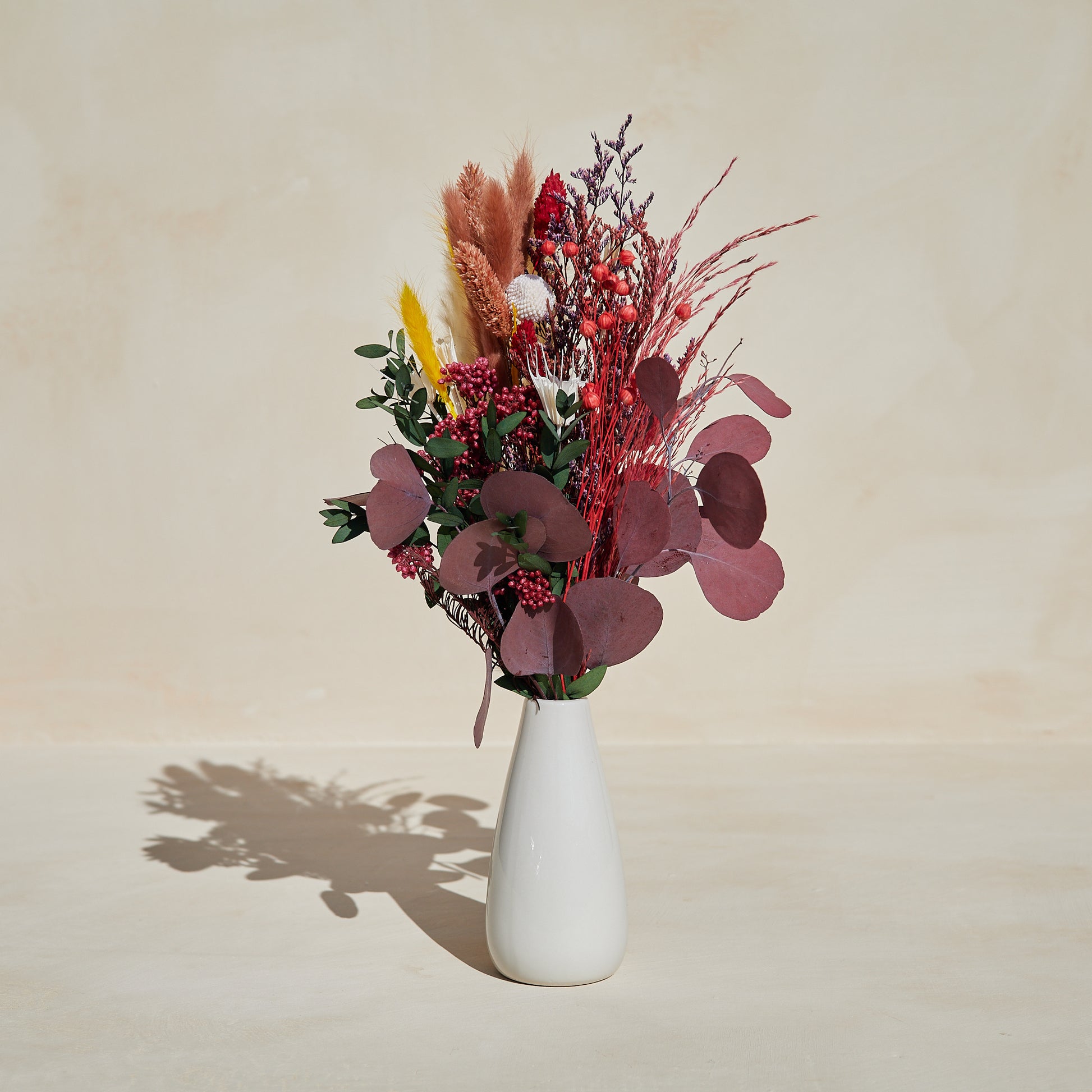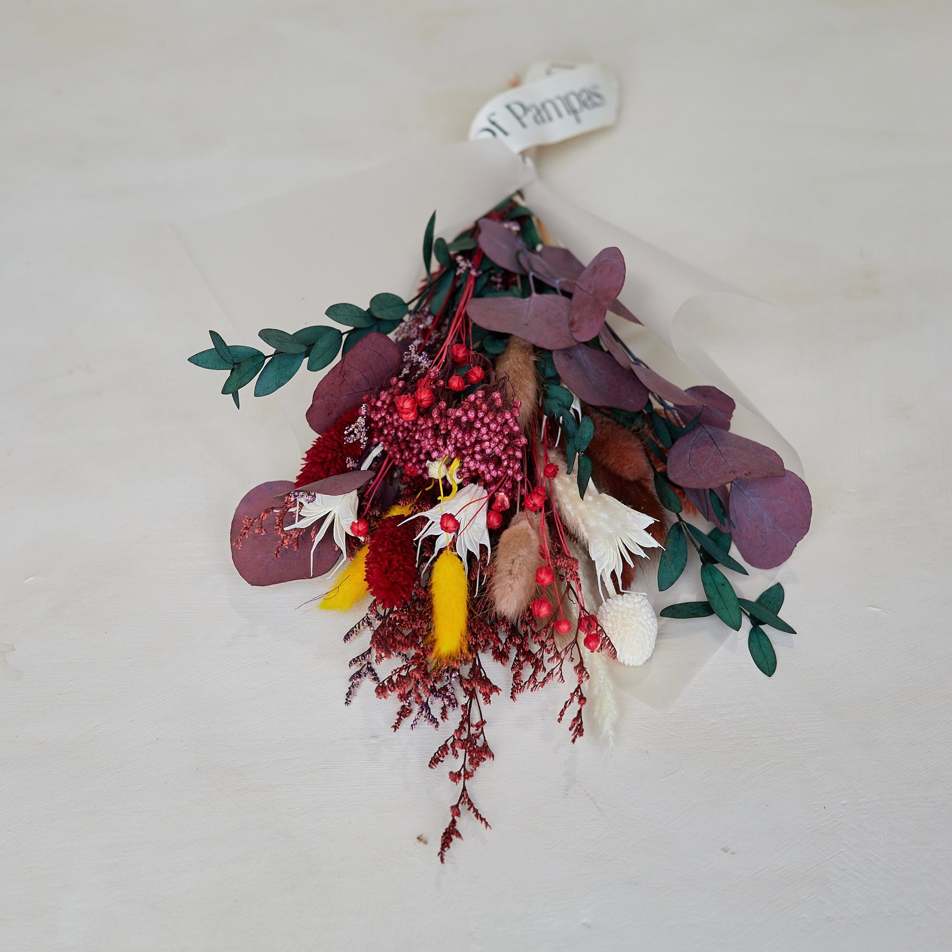 Small Dried Bouquet in red is approximately 14” tall perfect for a bud vase. It feature a mix of dried florals including preserved eucalyptus, rice flower, limonium, bunny tails, and more/