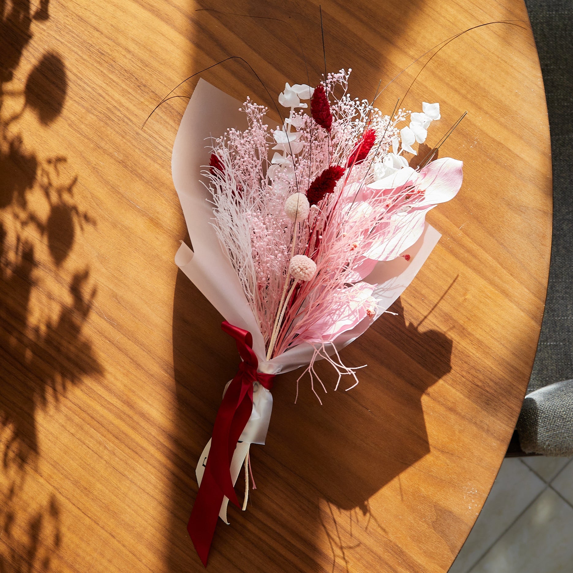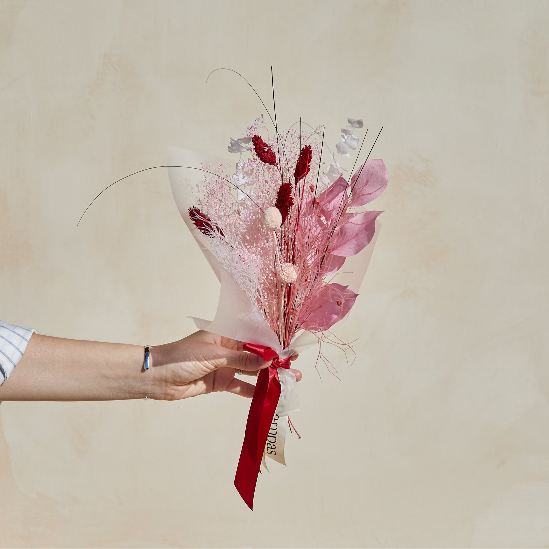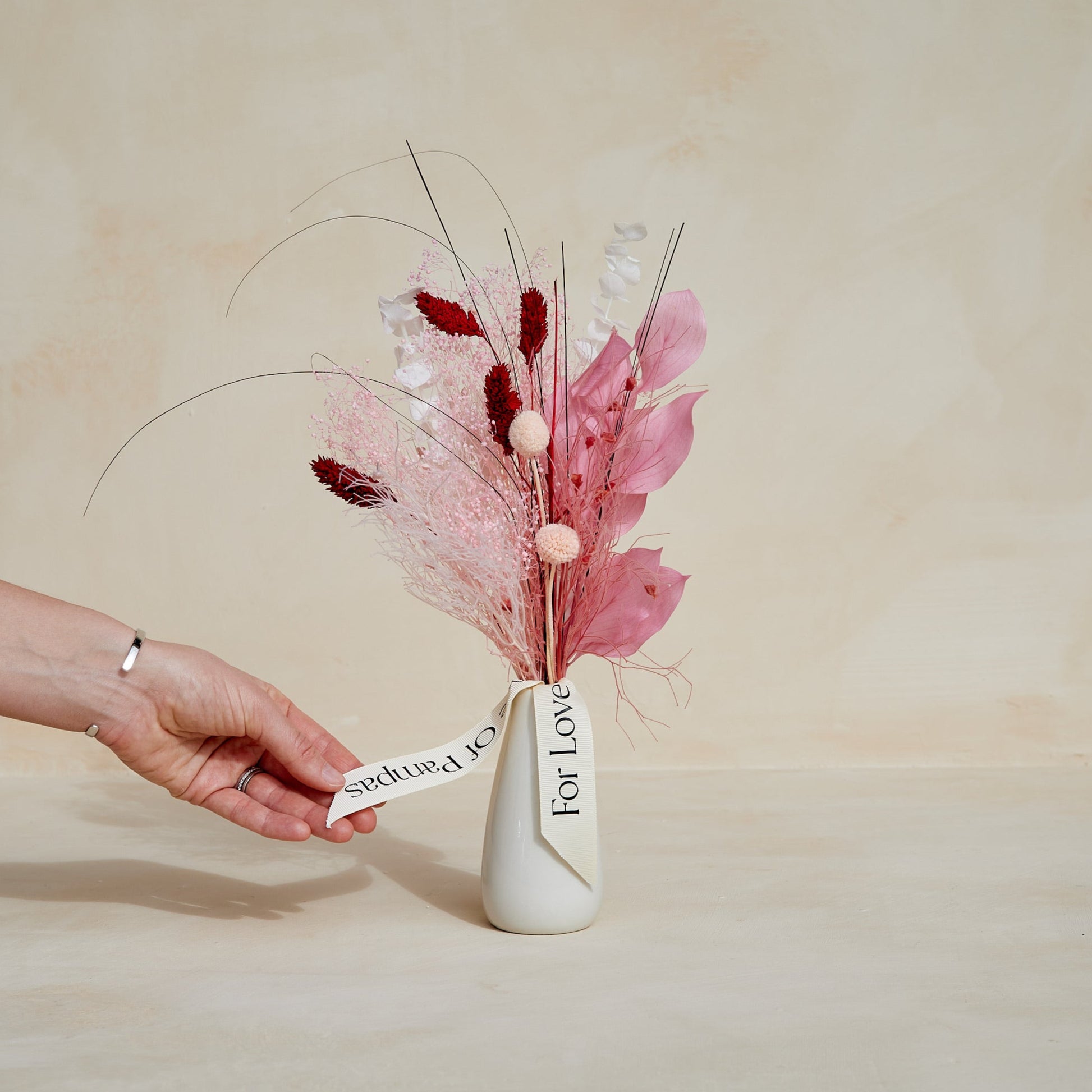 Composition: baby's breath in pink, billy balls in champagne, phalaris in red, dream grass in pink, preserved eucalyptus in white.